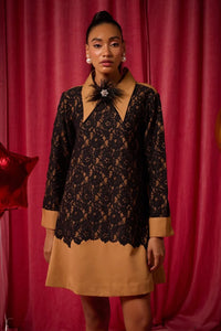 This elegant dress features a luxury crepe beige fabric adorned with intricate black lace patchwork. The full sleeves with just above the knee-length hem provide a graceful silhouette which offers a chic balance. An elongated collar frames the neckline beautifully, enhanced by a black striking feather brooch.