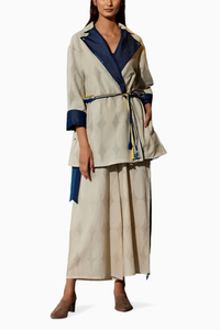 Featuring the Beige Blue Denim Jacket Coord Set by Jayati Goenka, a versatile duo for effortless style. This two-piece co-ord set includes a reversible block printed jacket paired with ankle-length lush cotton soft pants. Adorned with JG signature button knot details, crafted from natural dyed and handblock printed cotton blend fabric and denim.