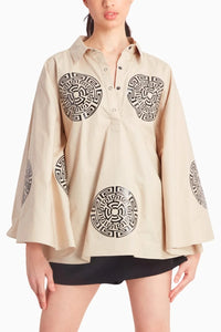 This beige circular cape is elegantly detailed with black leather cutwork appliqué, offering a sophisticated blend of texture and style. A unique and versatile piece that adds a bold, artistic touch to any outfit.