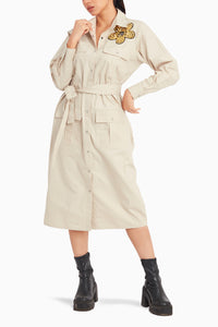 Introducing the Beige One Piece Cotton Dress with Embroidery and Belt. Made from soft cotton, this regular-fit dress features intricate stud embroidery that adds a touch of texture and style. The included belt accentuates the waist, offering a flattering silhouette while maintaining comfort and versatility for any occasion.