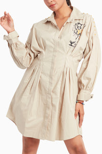 Introducing the Beige One Piece Cotton Dress with Pleat Tucks and Foil Print. Made from soft cotton, this regular-fit dress features elegant pleat tucks and a beautiful foil print, complemented by stud highlights for added texture and style. The dress combines comfort with modern design, making it a chic and versatile piece for any occasion.