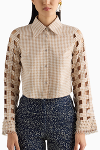 Featuring the Beige Embellished Crop Shirt by MellowDrama's by Utopia Collection. Made from 100% cotton, this cropped full-sleeve shirt features handcrafted weave detailing at the sleeve and crystal embellishments on the cuff. It includes a front opening with buttons and offers a regular fit for a blend of elegance and comfort.