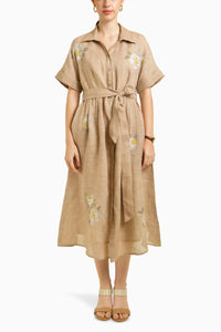 This beautiful beige embroidered drop-shoulder dress in gauze linen offers a relaxed, effortlessly chic fit. The delicate embroidery adds an elegant, handcrafted touch, while the lightweight gauze linen fabric ensures comfort and breathability. Perfect for warm-weather outings, this dress combines laid-back style with refined detailing for a sophisticated yet casual look.