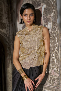 Beige waistcoat top inspired by Angrakha style. Intricate gold dori and ivory thread embroidery in geometric paisley and floral motifs across a natural base. Overlap front detail with internal string tie-up and two external tie-ups at the front. Band collar with a V-neck detail.