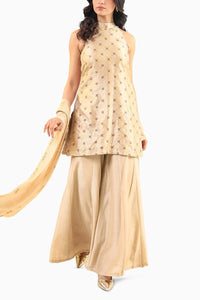 A graceful Indian designer ensemble that brings together tradition and sleek modernity. This beige halter-style kurta is crafted from handpicked Banarasi fabric, featuring an all-over zari weave that glimmers subtly with movement. It’s paired with flowy matching pants and a lightly embroidered dupatta that adds soft elegance to the look. Sophisticated and versatile, this set is perfect for festive brunches, mehendi events, or wedding after-parties.