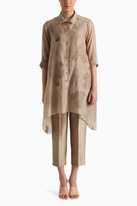 Introduce elegance to your wardrobe with our Beige Cotton Chanderi Shirt, adorned with beautiful handblock prints and hand embroidery. Paired with luxurious silk chanderi straight pants, this set seamlessly blends comfort with sophistication. Complete with a stylish slip, it’s perfect for a variety of occasions, from casual gatherings to special events.