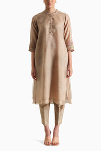 iscover elegance with our Beige Double Layer Tunic, adorned with beautiful machine embroidery on the sleeves. Made from luxurious Silk Chanderi and delicate Organza, this ensemble features a charming handblock print that adds an artisanal touch. Paired with coordinating Silk Chanderi pants, this set is perfect for both casual and formal occasions. Embrace style and comfort with this timeless outfit!