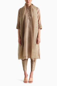 Elevate your style with our Beige Double Layer Tunic, featuring exquisite machine embroidery on the sleeves. Crafted from luxurious Silk Chanderi and airy Organza, this ensemble is perfect for any occasion. The handblock print adds a touch of artisanal charm, while the accompanying silk Chanderi pant ensures a comfortable fit. Complete the look with the elegant dupatta for a refined finish. Step out in sophistication and grace with this stunning set!