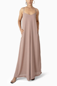 Featuring Beige Hawaii Jumpsuit by Kiran Gupta Label . This perfect summer jumpsuit in korean double georgette, light weight, flowy, in a burst of color with strappy ring detailing, comes with lining, side pockets and an elasticated back rim for the perfect fit.