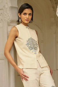 Sleeveless beige top crafted from soft earthy linen. Features a striking large ivory and black embroidered motif on the front and smaller motifs on the band collar. Concealed button-down placket and fully lined for comfort.