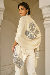 Soft earthy linen shawl in beige, featuring ivory and black embroidered edge borders and a dramatic central motif. Versatile styling options allow it to be worn as an attached drape or a separate piece.