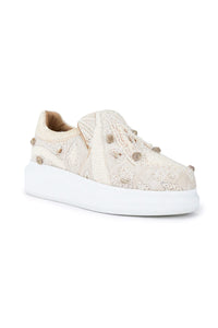 This design features materials true to its seaside inspiration. From conch shell embellishments to motifs of aquatic life, the Paradise classic sneakers are an ode to a good time. Each piece comes dressed up in a mix of aari and zardozi embroidery.