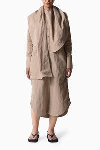 The Scarf Dress is a relaxed fit shirt dress with the front panel extending into a scarf that drapes around your neck. It is mid calf length and has full sleeves. The dress is enhaced with curved seams and delicate hand embroidered beads along them. Wear it as is or you can also slip it on over pants or jeans.