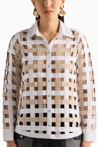 Featuring the Beige Weave Shirt by MellowDrama's by Utopia Collection. Crafted from 100% cotton, this full-sleeve shirt showcases handcrafted weave detailing. It includes a front opening with buttons, a curved bottom hem, and offers a regular fit for a stylish and comfortable wear.