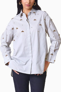 levate your style with The Bejeweled Bee Shirt, a sophisticated yet playful statement piece. This light gray button-down shirt is adorned with intricately embroidered bee embellishments and sparkling rhinestone accents, adding a touch of nature-inspired elegance. Crafted from high-quality fabric with a relaxed fit, it blends luxury with everyday wearability. Perfect for those who love unique, eye-catching fashion with a refined edge.