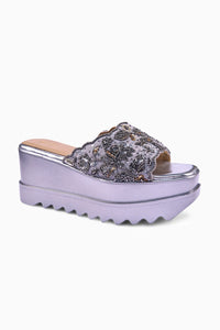 Our Bejewelled Barfi wedge sandals are crafted from suede-textured fabric and adorned with floral embroidery in grey and metallic tones, featuring cutdana work, salli work, and sequins. The embellished strap rests on a silver wedge, with scalloped edges adding a touch of charm.