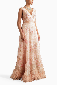 Featuring the elegant Belinda Dress by NSS from the Bloom Collection. Made of Tulle & Crepe in a graceful Blush shade. The dress features exquisite hand-appliquéd floral details and includes a matching inner slip for a complete and enchanting look.
