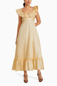 Featuring Bella Dress Champagne Dress by Malie. This dress showcases a wider neckline adorned with ruffles and a shaped V at the front. Its silhouette is elegantly A-line, complemented by a charming ruffle detail at the bottom. The dress fastens with a discreet zipper on the right side and falls gracefully to a midi length.