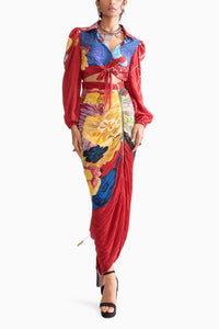 Featuring Bella Red Shirt with Bella Skirt by Saaksha & Kinni from Botanica Collection. Chic and playful, this daisy print collared tie-up shirt pairs perfectly with the daisy print hand micro pleat skirt. The skirt showcases an adjustable tie-up length and zipper detailing for a customizable fit.