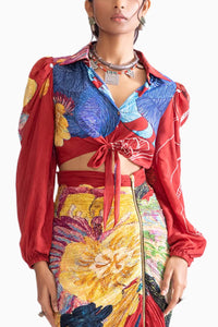 Featuring Bella Red Shirt by Saaksha & Kinni from Botanica Collection. This daisy print collared tie-up shirt offers a fresh, playful twist with its charming floral pattern and adjustable tie-up detail.