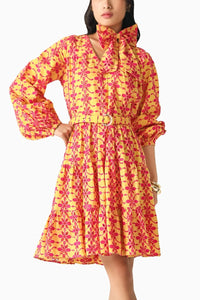 A vibrant yellow and pink floral midi dress with a flattering V-neckline. The belted waist accentuates the figure, while voluminous sleeves add drama. Crafted from lightweight fabric, it's perfect for sunny days.