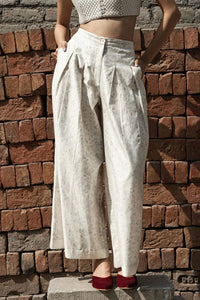 The 4-pleated pant features a boyfriend-style design with front pleats, side pockets, and a voluminous wide leg for a relaxed yet chic fit. Crafted from chanderi, the printed lining creates a perfect sheer look, while the impeccable tailoring adds to the overall sophistication. With their flattering cut and versatile design, these pants are ideal for on-the-go days, making them a must-have addition to your wardrobe.
