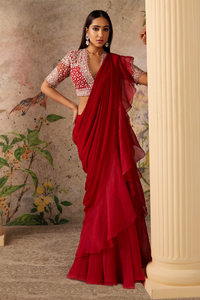 Indulge in elegance with our exquisite saree featuring a heavily net embroidered blouse paired with a chiffon drape saree and organza ruffle. The blouse stands out with its dusky pink thread detailing and embellishments, adding a touch of sophistication to the ensemble. Perfect for special occasions and festive celebrations, this saree effortlessly combines traditional charm with modern flair. The meticulous craftsmanship and thoughtful design ensure a timeless look that captures attention. Elevate your style with this stunning saree, making a memorable statement at any event.