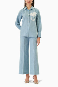 This elegant cotton set features exquisite 3D floral embroidery in delicate organza, creating a sophisticated, textured look. Perfect for adding a touch of femininity and charm to any occasion.