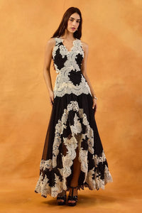 This sleeveless dress features a fitted bodice and a flowing high low hem with layered lace borders. A deep V neckline with scalloped edges and symmetrical ivory lace applique on sheer black fabric creates a romantic silhouette with a front slit.