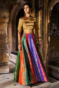 A stunning flared maxi skirt crafted from Benares brocade with multicolour panels and intricate metallic thread floral embroidery. Features a concealed side zip, internal drawstring, and fully lined construction with fused hem for shape and structure. Each panel tells its own unique story in colour and weave.