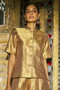 Half-sleeve top in intricate Benares brocade with hammered gold buttons at the front. Band collar with a straight cut. Garment is semi-lined.