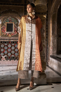 Longline top in Benares tissue with placed metallic stripes in tones of rust, gold, and silver. Boxy fit with dolman sleeves and exaggerated half-sleeve cuffs. Shirt collar with front closure in polished marble buttons with gold inlay. Relaxed fit. Comes with a slip.