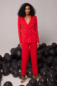 This bold red double-breasted blazer features full sleeves and eye-catching heart-shaped rhinestone detailing on the front, adding a playful touch to its sophisticated design. Paired with sleek red straight pants, the ensemble exudes a confident and stylish vibe, perfect for making a statement with both elegance and fun.