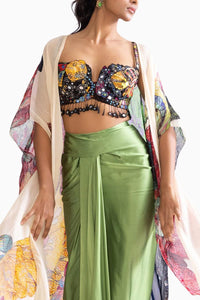 Featuring Bermuda Black Bustier by Saaksha & Kinni from Botanica Collection. Make a stunning statement with our Intricate mirror and thread work hand embroidered bustier, showcasing exquisite embroidery and hanging mirrored tassels for a dazzling, attention-grabbing effect.