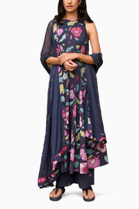 Featuring a kurta set in Persian blue color is tailored in mulmul fabric. Fitted at the bust and flared at the bottom, it has a high neckline with raglan-cut sleeves and pockets on both sides. It has foliage print all over and has a potli button closure at the back. It comes with floral print cotton pants and chiffon dupatta having a statement border to complete the set.