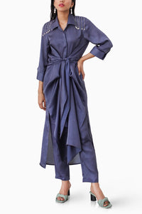 This easy breezy Twist Kurta Set is made comfortable enough to lounge in yet formal enough to wear it out for your next meeting. The calf length kurta has slits on the side, a 3/4th sleeve length and hand embroidered beads from the shoulder, giving it the right amount of movement. Designed with an extended panel that ties up at the front perfectly cinching the waist. Pair it up with its elasticated straight pants.