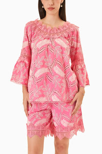 The Berry Top a nd Berry Shorts a re the perfect duo for a chic summer look in bea utiful sha des of pink. Cra fted from 100% cotton, the Berry Top fea tures a rela xed fit tha t gra cefully highlights your shoulders, combining elega nce with effortless style. Delica te la ce a ccents on the sleeves a dd a touch of sophistica tion to the design. Pa ir it with the Berry Shorts, a lso ma de from 100% cotton, offering a rela xed fit a nd ela stica ted wa ist for ultima te comfort. The shorts a re bea utifully edged with ma tching pink la ce, completing the look. Whether you choose to wea r them together or mix with white pa nts or jea ns, these pieces a re the perfect choice for a stylish, la id-ba ck summer ensemble.