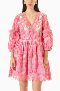 Cra fted in soft pure cotton with a pla y of orga nic lea f motifs in contra st threa d broderie a ngla ise on fuchsia pink ba se - the dress is deta iled with ha nd bea d work a nd edge la ce a round the neckline a nd a bold sca llop la ce on the skirt. The dress ha s smocking on the wa ist to give a curvy fit.