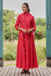 The Berry Floral Anarkali, in a regal hue, is adorned with delicate applique floral bunches, complemented by a flowing silhouette that moves with elegance. Paired with a matching dupatta, this ensemble brings refined charm to festive occasions.