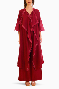 A symbol of sophistication and grace. Crafted from luxurious fabric in a rich berry hue, this cape boasts a flowing silhouette that exudes elegance and allure. Adorned with intricate detailing, it captures the eye. Paired with spaghetti top and palazzo pants exude confidence and style. Perfect for both formal events and casual outings, this set adds a touch of vibrance to any ensemble, ensuring you make a statement with effortless grace and allure.ÂÂÂ