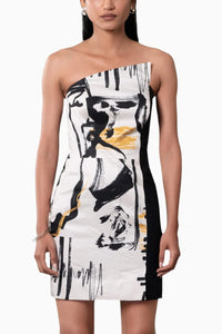 The Beru Mini Dress is a chic strapless design that features a bold asymmetrical neckline, adding a modern edge to its classic silhouette. A contrasting side panel creates visual interest and dimension, making this mini dress a stylish and striking choice for any occasion.