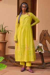The Bery Kurta is made from handwoven Chanderi, featuring block-printed details and a side slit. It is adorned with intricate hand-done embellishments, offering a perfect blend of traditional craftsmanship and contemporary style.