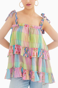 Featuring Bespoke Hand Embroidered Strap Top by Nikasha from Under The Banyan Tree Collection. Crafted from 100% cotton plaid with a touch of lurex. This top showcases exquisite hand embroidery, blending classic plaid patterns with subtle shimmer for a sophisticated and unique look.