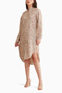 Featuring Bespoke mughal print hi-low shirt dress in 100% Cotton poplin with french knots and sequins embroidery on the shoulder and hand stitch detailing on the placket and cuffs.