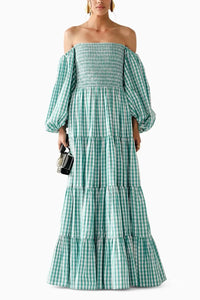 A breezy, off-shoulder maxi dress with a smocked bodice for a flattering fit. The puffed sleeves and tiered skirt add volume and movement. The green gingham print exudes a fresh, timeless charm. Perfect for summer getaways or casual brunches. Pair with statement earrings and a mini bag for an elegant touch.