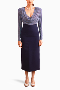 Featuring a cowl neckline with rainbow Swarovski studs, the Betrice Co-ord Set by House Of Exotique includes a bodysuit with shoulder pads and snap button fastening, a Swarovski-embellished bralette, and a pencil skirt with a back zipper. Sophisticated and stylish in blue with heat press embroidery.