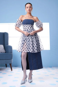 Featuring Betsey Polka Print Co-ord Set by Mero's DOT collection. This unique co-ord set blends denim and organza, featuring a polka dot organza top with denim panels and puffed sleeves, paired with a denim skirt detailed with a side slit. A bold mix of texture and playful charm.