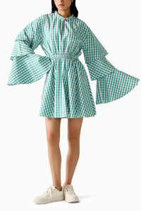 A chic and playful mini dress featuring dramatic layered bell sleeves. The cinched waist creates a flattering silhouette, while the green gingham print keeps it classic. Styled with sneakers and a bucket hat, it's ideal for a casual day out. Lightweight and comfortable, perfect for warm-weather adventures.