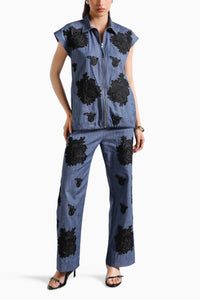 A denim coord set featuring black floral patches for a bold and fashionable statement.