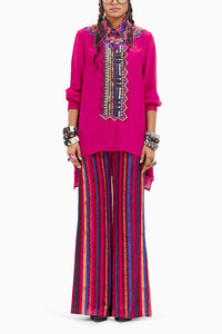 Featuring the Shocking Pink Atri Straight Shirt by Aseem Kapoor's Beyond Ken Collection. This solid color block shirt, crafted from Italian Crepe, boasts a detailed collar and beadwork. Paired with bootleg trousers, it offers an anti-fit silhouette and highlights the Shingora yoke for a touch of elegance.